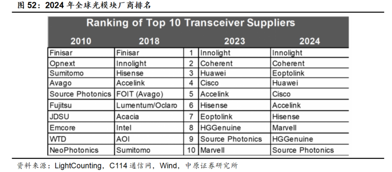 LightCounting发布的2024年全球光模块TOP10榜单显示,中国厂商已在该领域占据主导地位(占7席)。旭创科技(排名第1)和新易盛(排名第3)将其业务重点聚焦于服务北美云公司,专注于高速以太网光模块这一增长最快的细分市场,2024年均实现创纪录的盈利水平。华为排名第4,光迅科技、海信宽带、华工正源分列第6至9位,索尔思光电位居第10。这一格局充分展现中国厂商在全球光模块市场的主导地位。