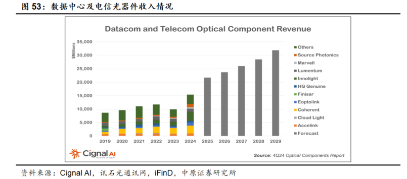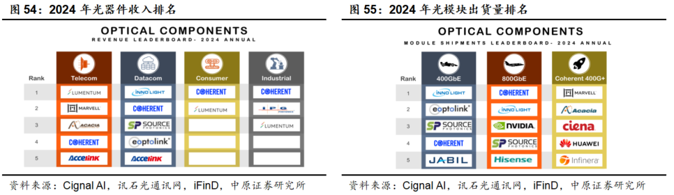 根据Cignal AI的测算,2025年数据中心光器件市场将增长60%以上,收入超过160亿美元,主要得益于400G和800G产品的持续放量。中际旭创、Coherent和新易盛是数据中心模块的主要供应商,Coherent、Broadcom和Lumentum是关键光器件的核心来源。尽管1.6T数据中心光模块将于2025年启动过渡,但在2026年前不会影响400/800G技术的增长率。电信器件收入将在2025年反弹,400ZR相干模块的持续增长与最新一代WSS模块及放大器销售加速形成合力。2024年Lumentum领跑电信器件收入榜,Marvell和Acacia等400ZR供应商紧随其后。