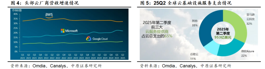 Canalys数据显示,25Q2全球云基础设施服务支出达到953亿美元,同比增长22%,连续四个季度同比增速超过20%。云服务需求的增长的推动因素有三方面:AI使用量的提升、传统系统迁移的复苏,以及云原生业务的规模化发展。随着头部云厂商不断增强AI能力和应用,越来越多客户开始采用多模型策略,以更好地兼顾成本控制和特定场景需求。25Q2,AWS、微软Azure和谷歌云保持上季度的排名,三者合计占据全球云基础设施支出65%的市场份额。总体来看,头部三家厂商的整体收入同比增长27%。