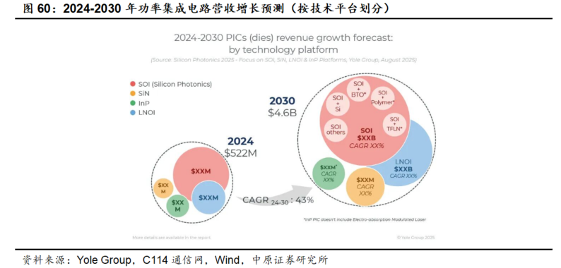 在数据中心领域(尤其是AI和机器学习),传统处理器架构正面临物理极限,而硅光子技术实现的高速通信对支撑更快速计算至关重要。不断增长的带宽需求不仅推动硅光子技术进步,也促进薄膜铌酸锂技术的发展,从而提升网络数据传输能力。 光子集成电路,尤其是绝缘体上硅(SOI)和绝缘体上铌酸锂(LNOI),为具有大规模、可扩展性的应用提供了多功能平台,尤其在数据中心领域,中国企业正崛起为新的领军者。凭借硅材料性能的稳定性,电信领域成为另一大应用场景。