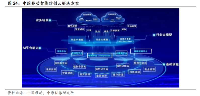 运营商聚焦工业制造、数字政府、医疗、教育、能源等关键领域,充分发挥云网融合及新一代数字技术的整合优势,推进数字技术与实体经济的紧密结合。三大运营商均全面接入DeepSeek开源大模型,实现在多场景、多产品中应用,针对DeepSeek-R1模型提供专属算力方案和配套环境,助力国产大模型性能释放。