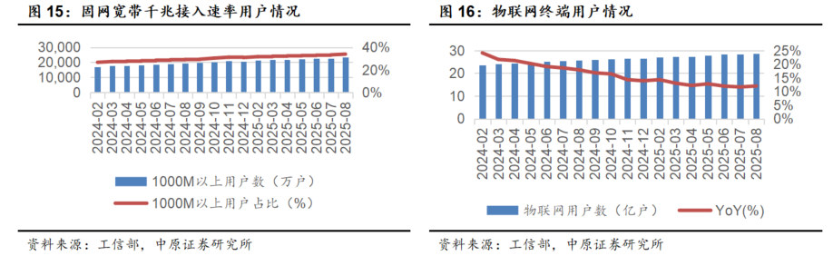 千兆用户数持续增加。截至2025年8月,三大运营商固网宽带接入用户总数达6.89亿户,比2024年末净增1885万户。其中,100Mbps及以上接入速率的固网宽带接入用户达6.55亿户,占总用户数的95.2%;1000Mbps及以上接入速率的固网宽带接入用户达2.33亿户,比2024年末净增2664万户,占总用户数的33.9%,占比较2024年末提升3.0pct。运营商的宽带主推策略为千兆融合,不断推动存量用户升级迁移,促进千兆宽带快速普及。运营商通过组网、安防、云应用等智慧家庭服务,拓展家庭市场业务边界,实现收入增长。