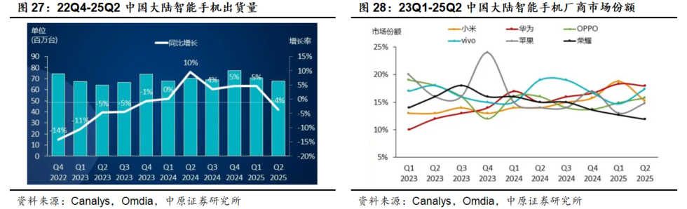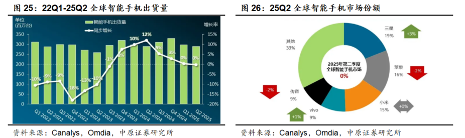 根据Canalys的测算,25Q2全球智能手机市场同比-1%。各大厂商在消费者情绪谨慎,全球宏观经济环境不确定性的背景下,整体表现稳定。25Q2,三星维持市场领先地位,凭借其Galaxy A系列,占据19%的市场份额;苹果位列第二,占比16%。小米占据15%的市场份额;vivo和传音分别以9%的市场份额跻身前五。
