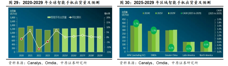 Canalys预计2025年全球智能手机出货量为12.2亿台,同比+0.1%,2025-2029年市场预计将以1%的CAGR温和增长。