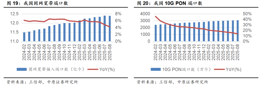 千兆光纤宽带网络建设持续推进。截至2025年8月,全国互联网宽带接入端口数量达12.39亿个,比2024年末净增3710万个。其中,光纤接入(FTTH/O)端口达到11.98亿个,比2024年末净增3771万个,占互联网宽带接入端口的96.7%;具备千兆网络服务能力的10G PON端口数达3076万个,同比+13.63%。