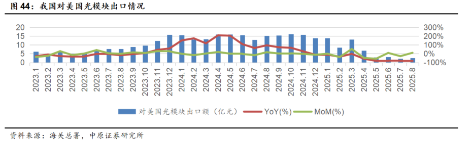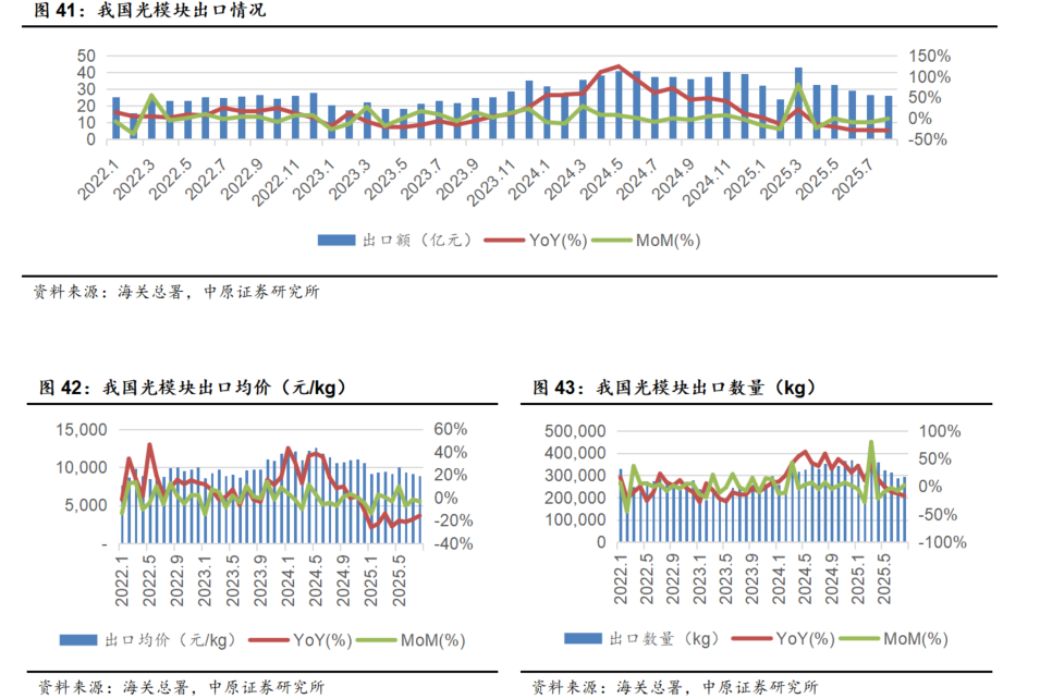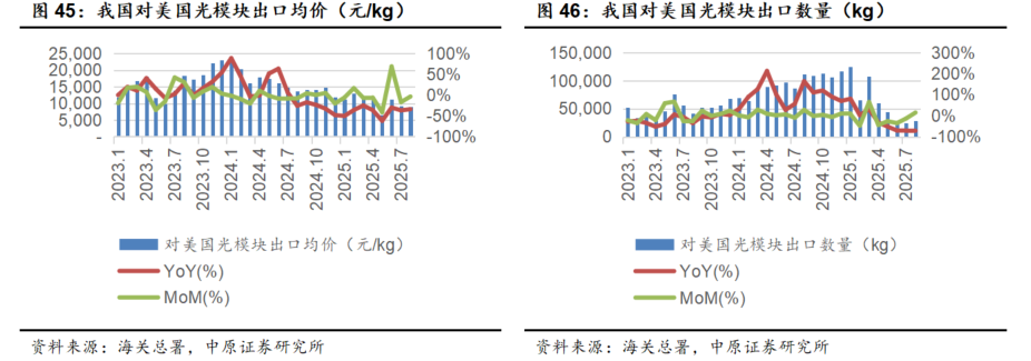 2025年8月,我国对美国光模块出口总额为2.5亿元,同比-83.2%,环比+10.6%;对美国光模块出口均价为8,974.35元/kg,同比-34.1%,环比-3.6%;对美国光模块出口数量为28,318kg,同比-74.5%,环比+14.7%。2025年1-8月,我国对美国光模块出口总额为53.3亿元,同比-54.7%。
