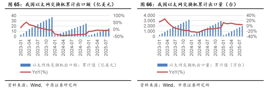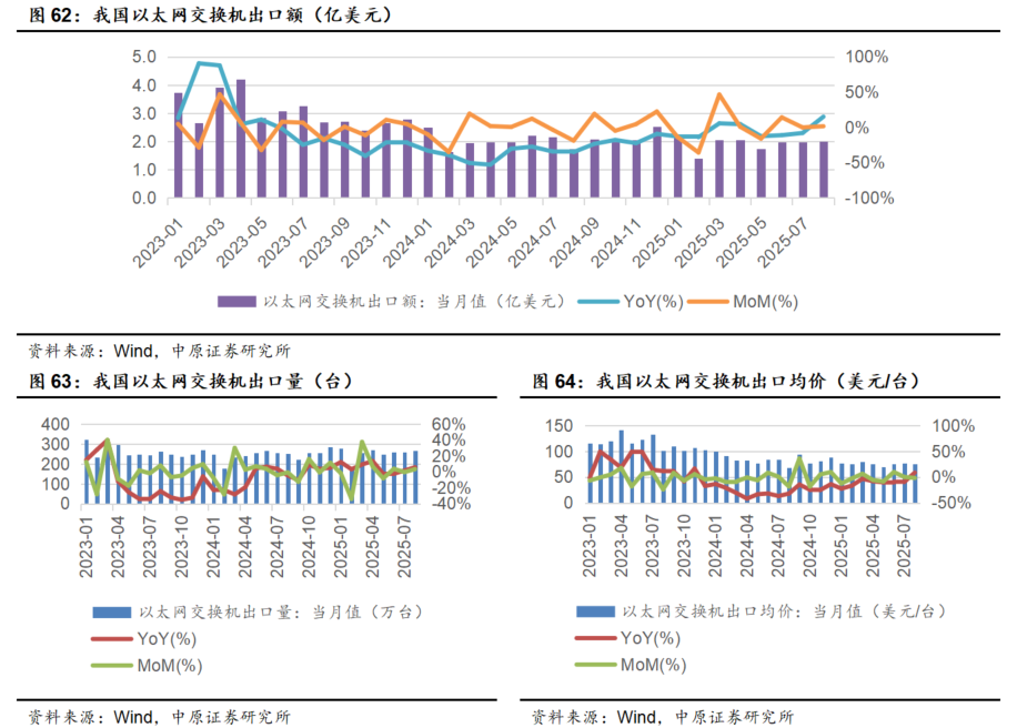 2025年8月,我国以太网交换机出口额为2.01亿美元,同比+15.1%,环比+1.6%;以太网交换机出口数量为267.40万台,同比+5.8%,环比+3.4%;以太网交换机出口均价为75.01美元/台,同比+8.7%,环比-1.8%。