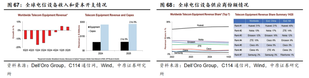 根据Dell’Oro Group的测算,经历连续两年电信设备投资下滑之后,六大电信设备领域(包括:宽带接入、微波与光传输、移动核心网(MCN)、无线接入网(RAN)以及运营商路由与交换机)25H1全球整体收入同比+4%。推动市场回暖的因素包括同比基数较低、库存趋于稳定以及有利的汇率变动。在中国以外的市场,情况改善尤为显著,25H1收入同比+8%。此次复苏在所有电信设备领域均有体现,以MCN、光传输和运营商路由与交换机的增长最为突出。全球供应商排名大体保持不变,不过市场份额略有调整:华为继续扩大份额,而爱立信和诺基亚较2024年略有下滑。