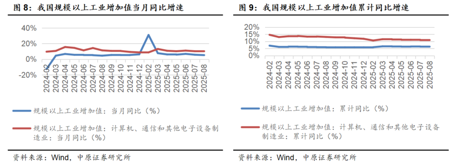 2025年1-8月,我国规模以上工业增加值同比+6.2%,TMT工业增加值同比+10.8%,TMT行业营收同比+8.8%,利润总额同比+7.2%。TMT工业增加值增速高于工业增加值整体增速,彰显新质生产力的推动作用。
