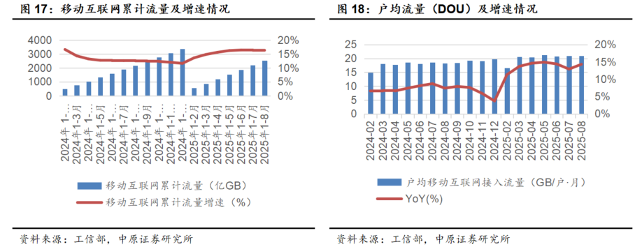 移动互联网流量延续较快增势,8月DOU值处于高位。2025年1-8月,移动互联网累计流量达2534亿GB,同比增长16.4%。截至2025年8月,移动互联网用户数达16.01亿户,比2024年末净增3132万户。2025年8月当月户均移动互联网接入流量(DOU)达到20.87GB/户·月,同比+14.3%。随着5G渗透率提高,未来DOU有望维持较高水平。