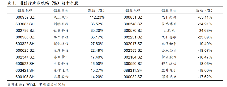 个股方面,上涨、持平、下跌个股数量分别为38只、0只、82只。涨幅前3分别为线上线下(+112.23%)、剑桥科技(+36.52%)、世嘉科技(35.20%);跌幅前3分别为*ST高鸿(维权)(-63.11%)、长芯博创(-24.91%)、太辰光(-24.63%)。