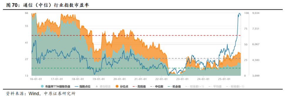 维持行业“强于大市”投资评级。截至2025年10月13日,通信行业PE(TTM,剔除负值)为23.32,处于近五年71.09%分位,近十年35.62%分位。考虑行业业绩增长预期及估值水平,维持行业“强于大市”投资评级。建议关注光通信、AI手机、电信运营商板块。1)光通信:头部云厂商2025年资本开支展望乐观,海外算力高速发展。AI发展推动大型数据中心的建设,拉动光器件产品需求持续且稳定增长。光模块的可靠性要求提高、迭代周期缩短,带来行业技术门槛显著提升,光模块头部厂商产品的优势将进一步凸显。在中美贸易摩擦的背景下,光芯片国产替代逻辑加强,业绩弹性较大。国产算力的持续建设将为交换芯片、交换机、训推一体机等算力业务带来新的增量。建议关注:中兴通讯、新易盛、华工科技、光迅科技、仕佳光子、太辰光。2)AI手机:功能的迭代升级及AI赋能技术创新的加持或带来全新的用户体验,AI手机创新化、高端化有望带来产品平均售价的提高和毛利率的改善。建议关注:中兴通讯、信维通信。3)电信运营商:三大运营商是优质红利资产,年中和年末两次现金分红,分红比例有望持续提升,具备高股息的配置价值。三大电信运营商eSIM手机商用试验获批,有助于其拓展业务场景,推动产业生态升级。运营商传统业务收入质量提高,资本开支下降有望降低未来折旧和摊销成本,经营保持稳健。此外,运营商依托自身在数据中心、大数据、网络基础设施等领域的优势,有望借助AI重构商业模式。建议关注:中国移动、中国联通、中国电信。
