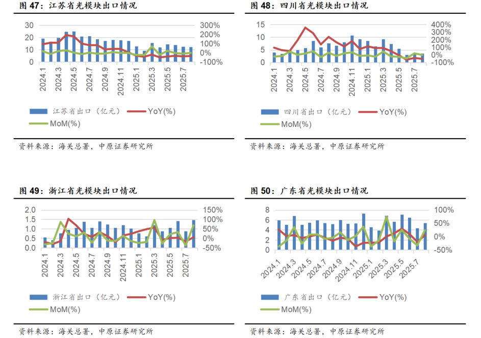 2025年8月,浙江、广东光模块出口额环比增速较高。从省份出口数据来看,2025年8月,江苏省出口额为12.20亿元,环比-1.9%;四川省出口额为3.55亿元,环比-1.4%;浙江省出口额为1.48亿元,环比+68.2%;广东省出口额为5.42亿元,同比+24.0%。