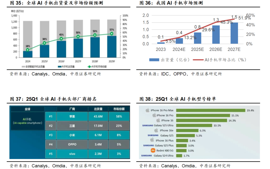 从技术趋势来看,功能的迭代升级及AI赋能技术创新的加持,后续AI手机市场渗透空间有望进一步提升。Canalys预计2025年AI手机渗透率将达到34%,端侧模型的精简以及芯片算力的升级将进一步助推AI手机向中端价位段渗透。2025年芯片厂商发布的新款次旗舰SoC,如骁龙8s Gen4、天玑 9400e已具备流畅运行端侧大模型的能力,DeepSeek的出现在很大程度上降低大模型对于芯片算力的开销。在这两大因素的共同作用下,2025-2026年AI手机预计会保持高速渗透的趋势。