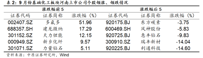 2025年9月,17家河南基础化工行业上市公司中,9家上涨,8家下跌,其中多氟多、建龙微纳、天力锂能、新乡化纤和力量钻石表现居前,分别上涨51.96%、17.29%、12.15%、9.57%和5.11%,利通科技、瑞丰新材、惠丰钻石、风神股份和东方碳素表现居后,分别下跌14.59%、14.05%、9.83%、5.83%和3.75%。