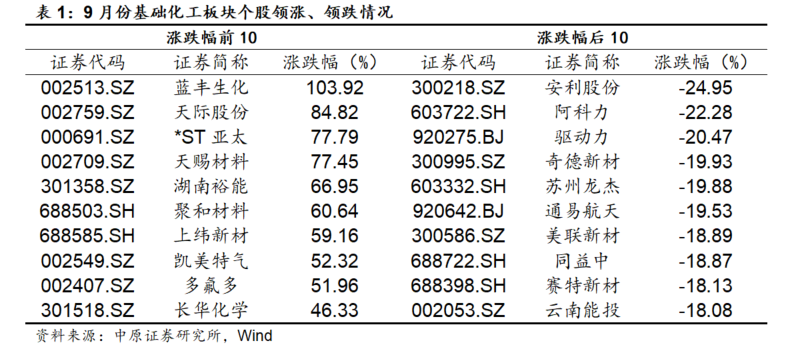 2025年9月,基础化工板块524只个股中,共有215支股票上涨,309支下跌。其中蓝丰生化、天际股份、*ST亚太、天赐材料和湖南裕能位居涨幅榜前五,涨幅分别为103.92%、84.82%、77.79%、77.45%和66.95%;安利股份、阿科力、驱动力、奇德新材和苏州龙杰跌幅居前,分别下跌24.95%、22.28%、20.47%、19.93%和19.88%。