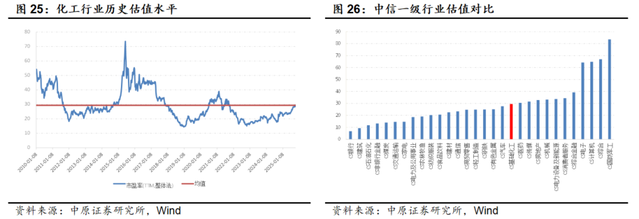 根据Wind数据,截止2025年10月14日,中信基础化工板块TTM市盈率(整体法,剔除负值)为28.50倍。2010年以来,行业估值平均水平为29.32倍,目前估值水平略低于历史平均水平。与其他中信一级行业横向对比,基础化工行业估值在30个行业中位居19位,维持行业“同步大市”的投资评级。10月份的投资策略,随着各行业反内卷整治的进一步深入以及稳增长措施的出台,化工行业供需格局有望进一步优化,建议两个维度寻找投资机会。