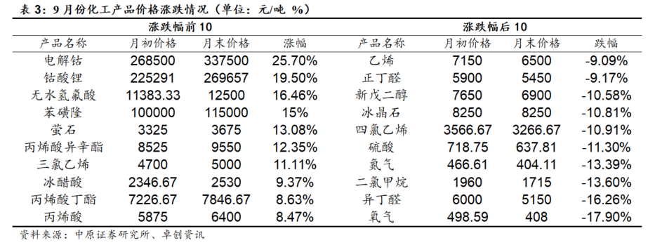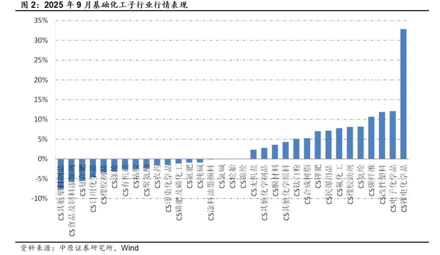 根据Wind数据,2025年9月,33个中信三级子行业中,16个子行业上涨,17个子行业下跌。其中锂电化学品、电子化学品和改性塑料行业表现居前,分别上涨32.82%、12.09%和11.91%,其他塑料制品、食品及饲料添加剂、复合肥行业表现居后,分别下跌7.61%、5.72%和5.57%。