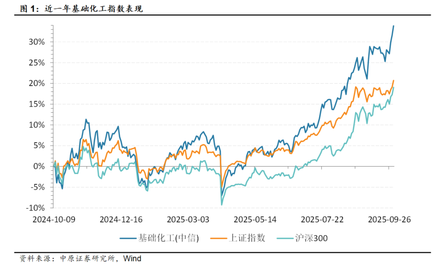 根据Wind数据,2025年9月中信基础化工行业指数上涨5.02%,跑赢上证综指4.38个百分点,跑赢沪深 300 指数1.82个百分点,行业整体表现在30个中信一级行业中排名第7位。最近一年来,中信基础化工指数上涨28.23%,跑赢上证综指11.86个百分点,跑赢沪深 300 指12.73个百分点,表现在30个中信一级行业中排名第10位。