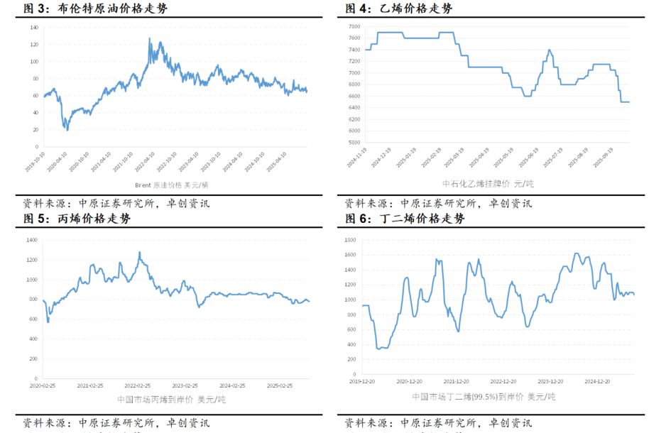 产品价格跟踪: 根据卓创资讯数据,2025年9月国际油价延续下行态势,其中WTI原油下跌2.56%,报收于62.37美元/桶,布伦特原油下跌1.61%,报收于67.02美元/桶。在卓创资讯跟踪的319个产品中,93个品种上涨,上涨品种较上月减少27个,涨幅居前的分别为电解钴、钴酸锂、无水氢氟酸、苯磺隆和萤石,涨幅分别为25.70%、19.50%、16.46%、15%和13.08%。175个品种下跌,下跌品种环比提升19个。跌幅居前的分别是氧气、异丁醛、二氯甲烷、氮气和硫酸,分别下跌了17.90%、16.26%、13.60%、13.39%和11.30%。总体上看,基础化工产品价格延续下跌态势。