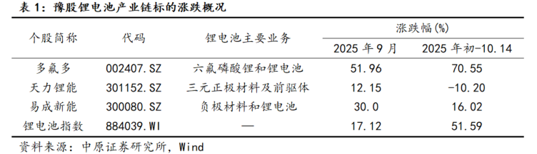 锂电池产业链中,豫股相关标的主要包括多氟多、天力锂能和易成新能3只标的,标的数量在锂电池概念板块中占比2.83%,其业务主要包括电池制备及其关键材料,具体包括锂电池、正极材料、负极材料和六氟磷酸锂。2025年9月,多氟多上涨51.96%,天力锂能上涨12.15%,易成新能上涨30.0%
