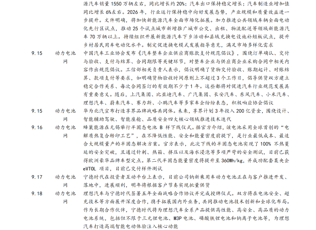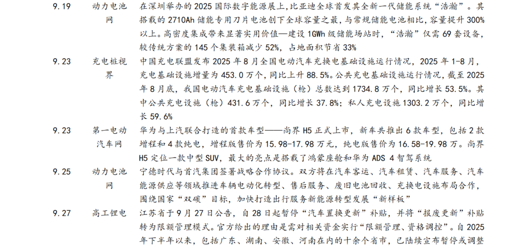 2025年9月,我国新能源汽车销售同比持续增长且环比持续增长,主要系国以旧换新政策效果继续显现,行业综合治理“内卷”工作取得积极进展,地方车展火热进行,企业新品密集上市,汽车市场整体延续良好态势。2025年1月,国家出台了实施大规模设备更新和消费品以旧换新的政策,预计将持续促进汽车消费,同时我国新能源汽车性价比提升且在全球已具备较强竞争力,预计全年新能源汽车销售将持续增长。9月锂电池板块走势强于沪深300指数,主要与市场风格切换、新能源汽车销售持续增长、储能锂电池需求超预期和固态电池相关动态相关。结合国内外行业动态、细分领域价格走势、月度销量及行业发展趋势,行业景气度总体持续向上,短期重点关注上游原材料价格走势、月度销量、国内外相关政策及固态电池相关进展。考虑行业相关政策表述、原材料价格走势、板块业绩情况、目前市场估值水平及行业未来增长预期,短期建议持续关注板块投资机会,同时密切关注指数走势及市场风格。中长期而言,国内外新能源汽车行业发展前景确定,板块值得重点关注,同时预计个股业绩和走势也将出现分化,建议持续重点围绕细分领域龙头布局。