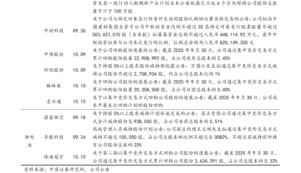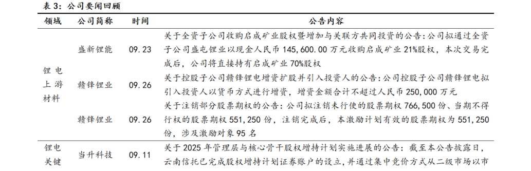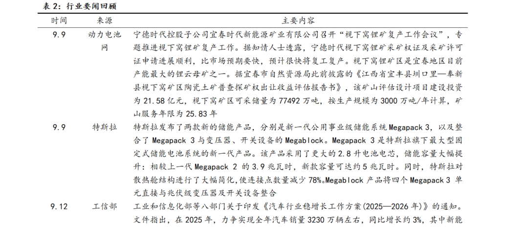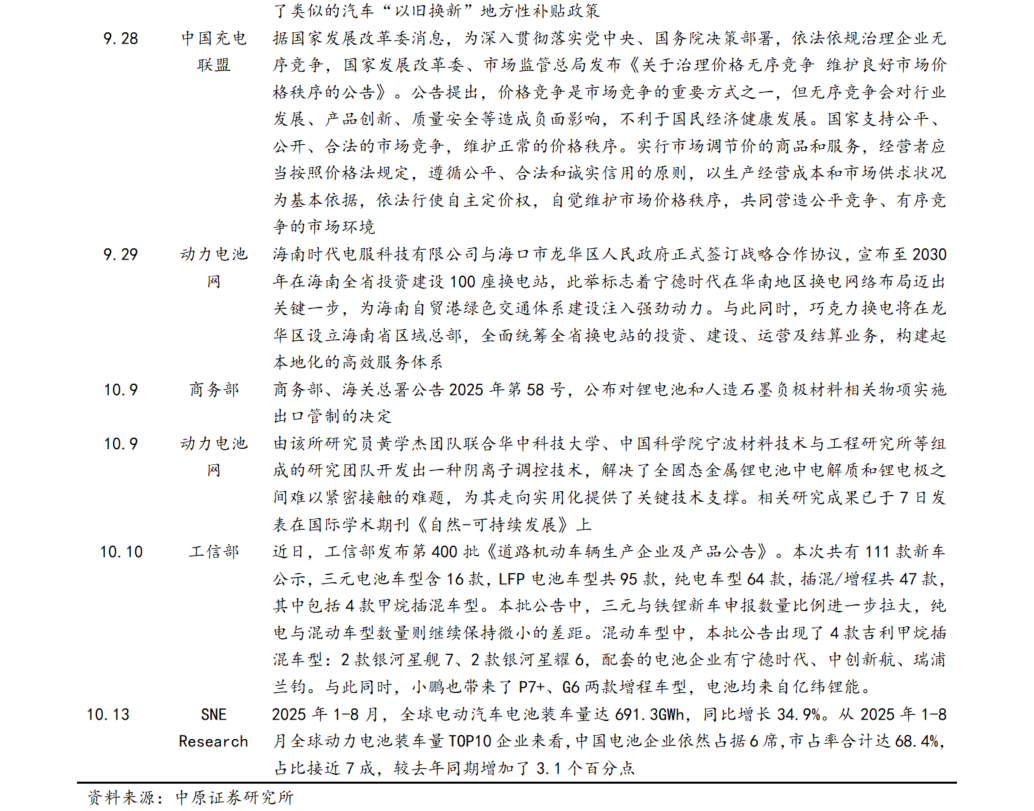维持行业“强于大市”投资评级。截至2025年10月14日:锂电池和创业板估值分别为29.01倍和43.42倍,结合行业发展前景,维持行业“强于大市”评级。9月锂电池板块走势强于沪深300指数,主要与市场风格切换、新能源汽车销售持续增长、储能锂电池需求超预期和固态电池相关动态相关。结合国内外行业动态、细分领域价格走势、月度销量及行业发展趋势,行业景气度总体持续向上,短期重点关注上游原材料价格走势、月度销量、国内外相关政策及固态电池相关进展。考虑行业相关政策表述、原材料价格走势、板块业绩情况、目前市场估值水平及行业未来增长预期,短期建议持续关注板块投资机会,同时密切关注指数走势及市场风格。中长期而言,国内外新能源汽车行业发展前景确定,板块值得重点关注,同时预计个股业绩和走势也将出现分化,建议持续重点围绕细分领域龙头布局。