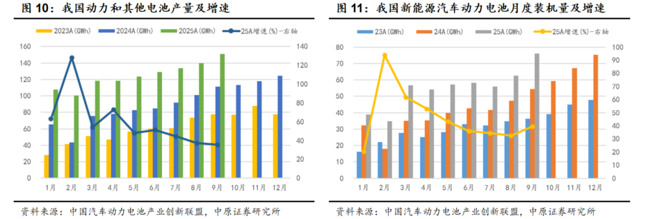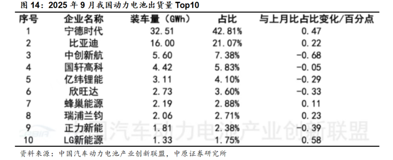 9月我国新能源汽车销售同比增长且环比持续增长。2025年9月,我国新能源汽车销售160.40万辆,同比增长24.63%,环比增长14.98%,9月月度销量占比49.72%,主要系政策层面持续鼓励,新能源整车性价比总体提升。2025年9月,我国动力电池装机76.0GWh,同比增长39.45%,其中三元材料装机占比18.16%;宁德时代、比亚迪和中创新航装机位居前三。