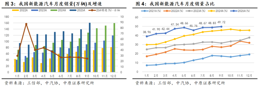 2025年9月,我国新能源汽车销售160.40万辆,同比增长24.63%,环比2025年8月增长14.98%;2025年9月月度销量占比49.72%,占比维持高位并创同期历史新高且环比8月占比提升。2025年9月,我国汽车企业出口65.20万辆,环比2025年8月增长6.71%,同比增长20.96%;新能源汽车出口22.20万辆,环比2025年8月回落0.89%,同比增长100%。9月我国新能源汽车销售和出口延续良好表现,主要系政策层面持续鼓励,新能源整车性价比总体提升,企业新品密集上市,行业综合整治“内卷”工作取得积极进展。2025年以来,我国新能源汽车合计销售1119.60万辆,同比增长34.55%,合计占比46.03%,其中新能源汽车合计出口175.80万辆,同比增长89.40%。展望2025年,我国经济工作将坚持稳中求进工作总基调,实施更加积极有为的宏观政策,有利于进一步坚定发展信心、激发市场活力。2025年1月8日,国家发改委和财政部发布了《关于2025年度加力扩围实施大规模设备更新和消费品以旧换新政策的通知》,近日国家层面已经下达第三批超长期特别国债支持消费品以旧换新资金,第四批将于10月份按计划下达,伴随政策组合效应不断释放,将进一步释放汽车市场潜力。叠加我国新能源汽车性价比提升和已具备较强的全球竞争力,预计2025年我国新能源汽车将继续呈现稳中向好发展态势,产销将持续保持增长,同时密切关注海外贸易保护进展及影响。