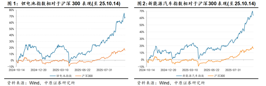 根据万得统计:2025年9月,锂电池板块指数上涨17.12%,新能源汽车指数上涨16.22%,而同期沪深300指数上涨2.59%。2025年9月走势显示:锂电池指数和新能源汽车指数走势均强于沪深300指数。