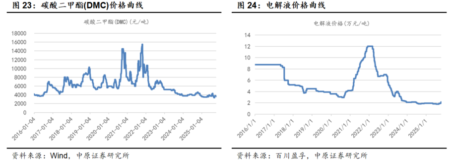 DMC为电解液主要溶剂,2023年以来价格承压,截至2025年10月14日:DMC价格为3650元/吨,较2025年9月初的3400元/吨上涨7.35%,总体预计区间震荡。电解液价格主要取决于上游电解质、添加剂和溶剂价格,同时与行业竞争格局紧密相关,且不同应用领域产品价格区别较大。2018年以来,电解液价格总体趋势向下,但2020年第三季度以来总体持续回升;2021年以来总体大幅上涨,年底价格为12万元/吨,较年初的4.15万元/吨上涨189.2%;2022年呈现先扬后抑走势,于11月见顶后持续回调。2023年以来总体持续承压,截至2025月10月14日价格为2.17万元/吨,较2025年9月初的1.75万元/吨上涨24.0%。结合六氟磷酸锂价格走势、行业成本、下游需求预期及产能释放,预计短期价格震荡向上。