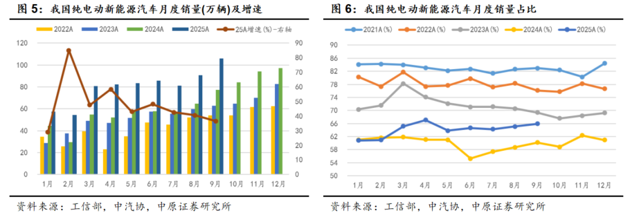 长期以来,我国新能源汽车坚持纯电动为主的发展战略。2022年我国纯电动合计销售535.18万辆,同比增长84.51%,合计占比77.87%;2023年合计销售665.46万辆,同比增长24.31%,合计占比70.54%;2024年合计销售771.5万辆,同比增长15.94%,纯电动合计占比60.0%。2025年9月,我国纯电动新能源汽车销售105.80万辆,同比增长36.52%,环比2025年8月增长16.52%,9月纯电动占比65.96%。2025年以来,我国纯电动新能源汽车合计销售721.60万辆,同比增长45.57%,合计占比64.45%。结合我国新能源汽车发展战略和历史占比,总体预计2025年我国纯电动占比仍将维持较高水平。