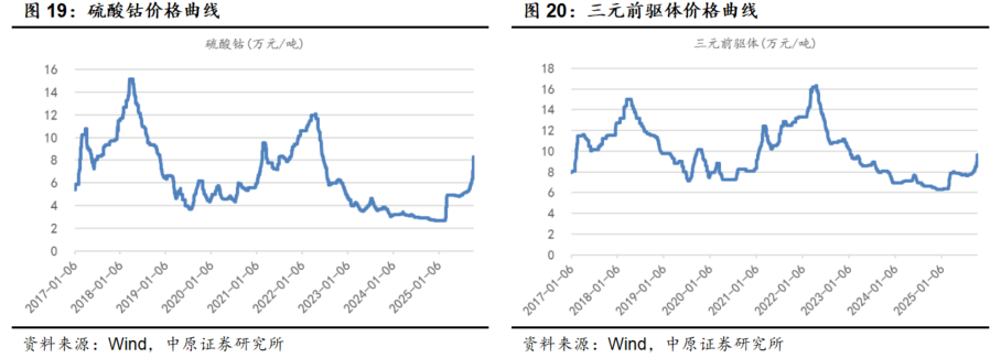 2023年以来,硫酸钴价格总体承压,趋势总体与电解钴价格趋同。2025年10月14日,硫酸钴价格为8.30万元/吨,较2025年9月初的5.25万元/吨上涨58.10%,与钴价走势趋同。三元前驱体主要原材料成本在于其中的钴,其价格趋势总体与硫酸钴价格趋同,2023年以来总体承压。2025年10月14日,三元前驱体价格为9.65万元/吨,较2025年9月初的7.80万元/吨上涨23.72%,结合钴价走势,短期总体震荡向上。