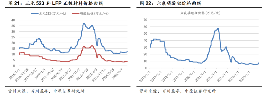 2019-2022年三元523正极材料价格走势总体与钴价趋同。2023年以来总体承压,截至2025年10月14日,三元523正极材料价格为12.65万元/吨,较2025年9月初11.91万元/吨上涨6.21%。磷酸铁锂价格2018年以来总体趋势为下降,2020底已呈现企稳向上特点;2021年以来总体震荡向上,于2022年12月见顶后总体持续承压。2025年10月14日价格为3.50万元/吨,较2025年9月初的3.62万元/吨回落3.45%,主要与碳酸锂价格变动相关。结合上游原材料价格走势、行业下游需求预期、产能释放进度和不同动力电池技术装机特点,预计短期震荡为主。