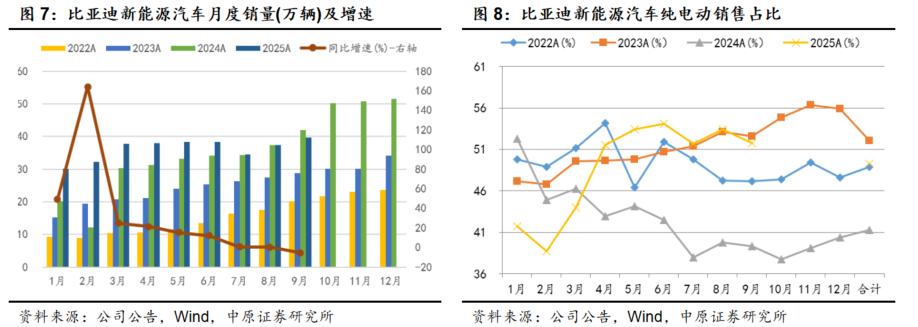2022年,比亚迪纯电动新能源汽车销售91.11万辆,在比亚迪新能源汽车销售中合计占比48.89%;2023年合计销售157.48万辆,合计占比52.07%;2024年合计销售176.50万辆,合计占比41.31%。2025年9月,比亚迪纯电动新能源汽车销售20.51万辆,同比增长24.31%,月度销售占比51.75%。2025年以来,比亚迪纯电动新能源汽车累计销售160.59万辆,同比增长37.31%,合计销售占比49.26%。