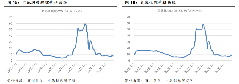 2020年氢氧化锂价格总体趋势为震荡下行;2021年以来氢氧化锂价格大幅上涨,于2022年12月见顶后回落,2023年以来总体持续承压。截至2025年10月14日,电池级氢氧化锂价格为7.63万元/吨,较2025年9月初的7.79万元/吨回落2.09%。结合产能释放进展、企业生产成本、下游需求增速、行业动态预期及行业发展趋势,电池级碳酸锂和氢氧化锂价格短期总体震荡为主,后续积极关注行业综合整治“内卷”相关进展,以及海外锂矿和碳酸锂进口量价走势。
