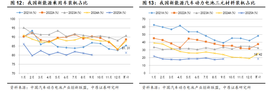 细分市场看:2022年乘用车合计市场占比88.66%;2023年占比90.85%;2024年小幅回落至87.71%。2025年9月乘用车装机60.90GWh,占比80.10%;2025年以来,乘用车合计装机占比81.31%。就材料体系而言:2022年三元材料合计占比37.48%,三元装机占比呈现回落态势; 2023年占比32.54%;2024年合计占比25.31%,较2023年显著回落7.23个百分点。2025年9月,三元材料装机13.80GWh,装机占比18.16%;2025年以来,三元材料装机合计装机占比18.42%。