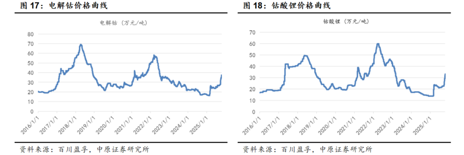 2020年,电解钴价格总体窄幅震荡;2021年总体震荡向上,年底价格为49.7万元/吨;2022年先扬后抑。2023年以来总体承压,截至2025年10月14日,电解钴价格37.55万元/吨,较2025年9月初的26.90万元/吨上涨39.59%,主要与刚果(金)出口政策调整相关,出口禁令解除后将于10月16日实施出口配额制。由于钴是钴酸锂重要原材料且成本占比高,钴酸锂价格总体与电解钴高度正相关。2019-2020年钴酸锂价格走势与电解钴趋同,总体为区间震荡;2021年以来总体震荡向上,2021年12月31日价格为42.8万元/吨;2022年呈现先扬后抑走势,2023以来总体承压。截至2025年10月14日,钴酸锂价格为33.40万元/吨,较2025年9月初的22.65万元/吨上涨47.46%,结合电解钴价格走势,预计钴酸锂价格短期将震荡向上。