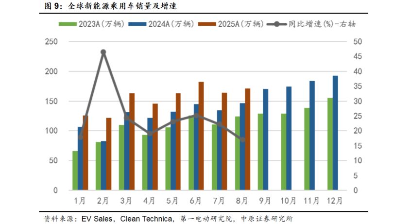 根据Clean Technica数据:2025年8月,全球新能源汽车销量171.34万辆,同比增长16.97%,环比2025年7月增长4.28%。2025年以来,全球新能源汽车合计销售1237.08万辆,同比增长23.46%。
