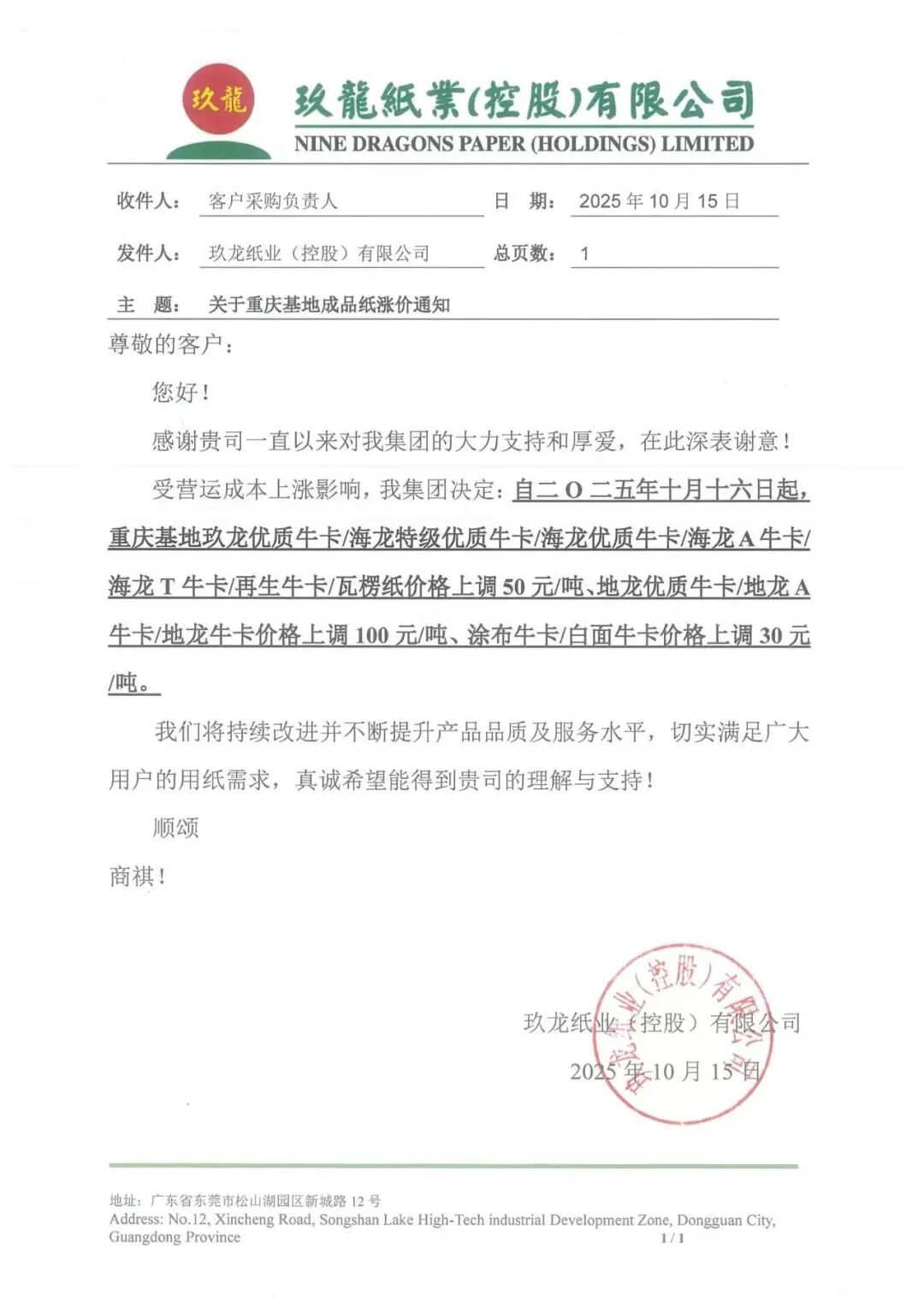 10月16日开始,重庆基地玖龙优质牛卡/海龙特级优质牛卡/海龙优质牛卡/海龙A牛卡/海龙T牛卡/再生牛卡/瓦楞纸价格上调50元/吨、地龙优质牛卡/地龙A牛卡/地龙牛卡价格上调100元/吨、涂布牛卡/白面牛卡价格上调30元/吨。