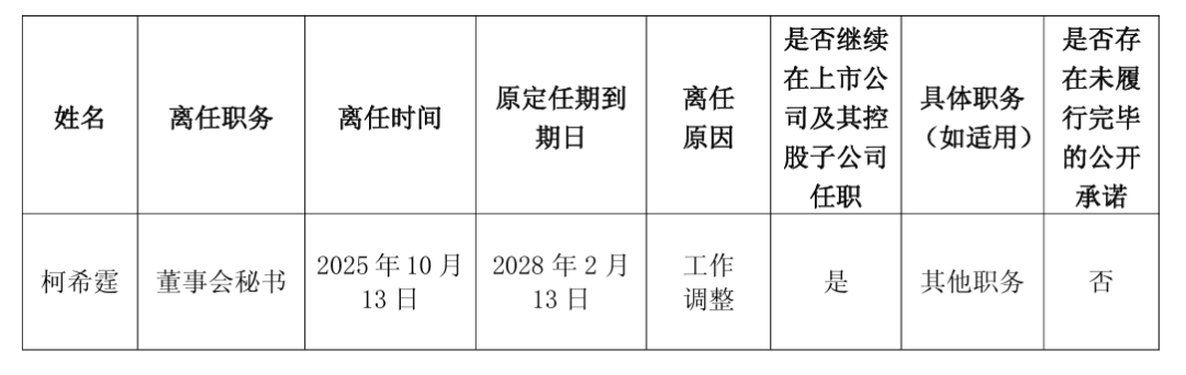 根据《公司法》、《公司章程》、《上海证券交易所股票上市规则》等相关规定,柯希霆先生的辞呈自送达公司之日起生效,辞职后柯希霆先生将继续在公司担任其他职务。柯希霆先生已按照公司相关规定做好交接工作,不存在未履行完毕的公开承诺,其离任董事会秘书职务不会影响公司正常的经营发展。