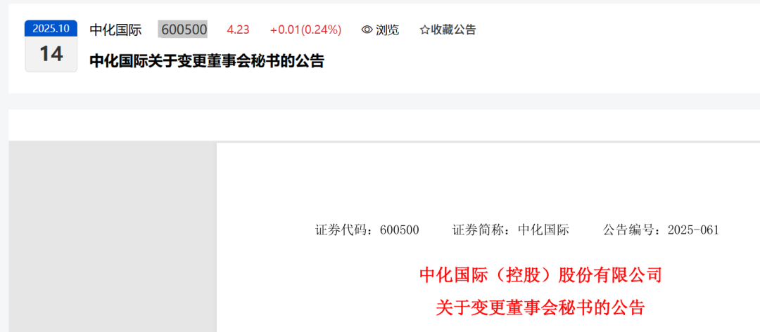 中化国际(控股)股份有限公司(以下简称“公司”)于2025年10月13日召开第十届董事会第十二次会议,审议通过《关于公司董事会秘书变动的议案》。柯希霆先生因工作调整申请辞去公司董事会秘书职务。经董事会提名与公司治理委员会审查通过,董事会同意聘任浦江先生为公司董事会秘书,任期自董事会审议通过之日起至第十届董事会任期届满之日止。
