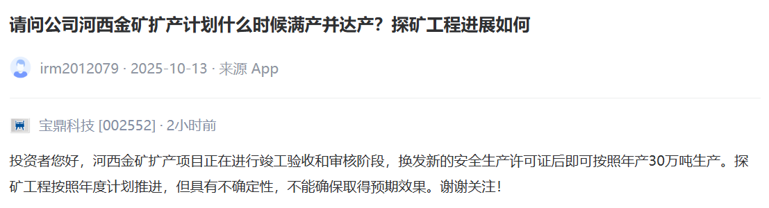 上证报中国证券网讯宝鼎科技16日在互动平台上回答投资者提问时表示,河西金矿扩产项目正在进行竣工验收和审核阶段,换发新的安全生产许可证后即可按照年产30万吨生产。