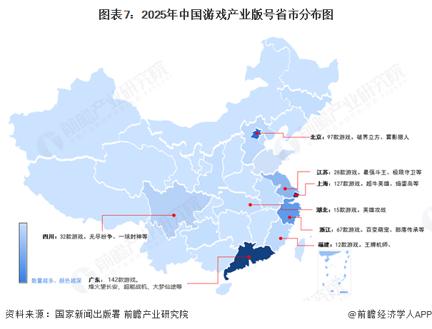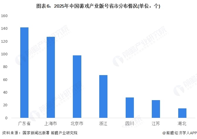 游戏产业版号区域分布图:广东省最多目前,我国2025上半年游戏产业版号最多的省市为广东省,数量为142个,其次是上海市、北京市、浙江省分别为127个、98个、67个,总量上均超过50个。