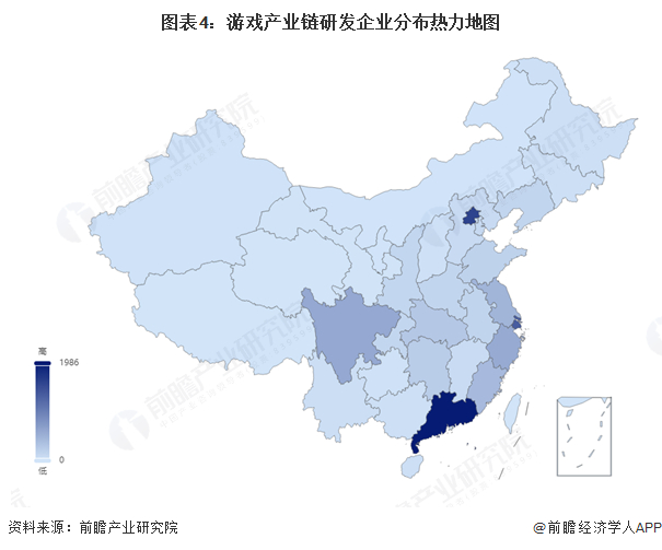 游戏产业链区域热力地图:广东分布最集中从我国游戏产业链企业区域分布来看,游戏产业链企业主要分布在广东省,其次是在北京市、上海市、四川省、浙江省、江苏省等地区;其余地方,如新疆、甘肃、青海、西藏等省份虽然有企业分布,但是数量极少。