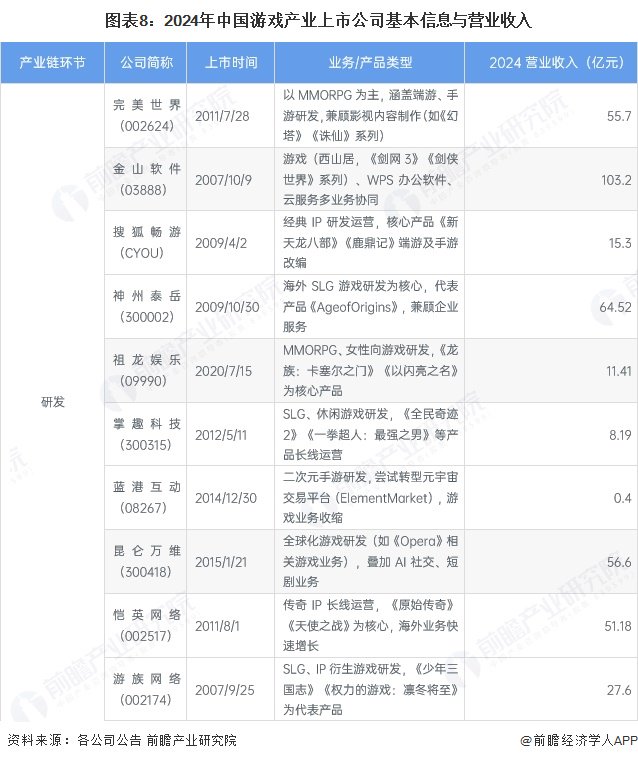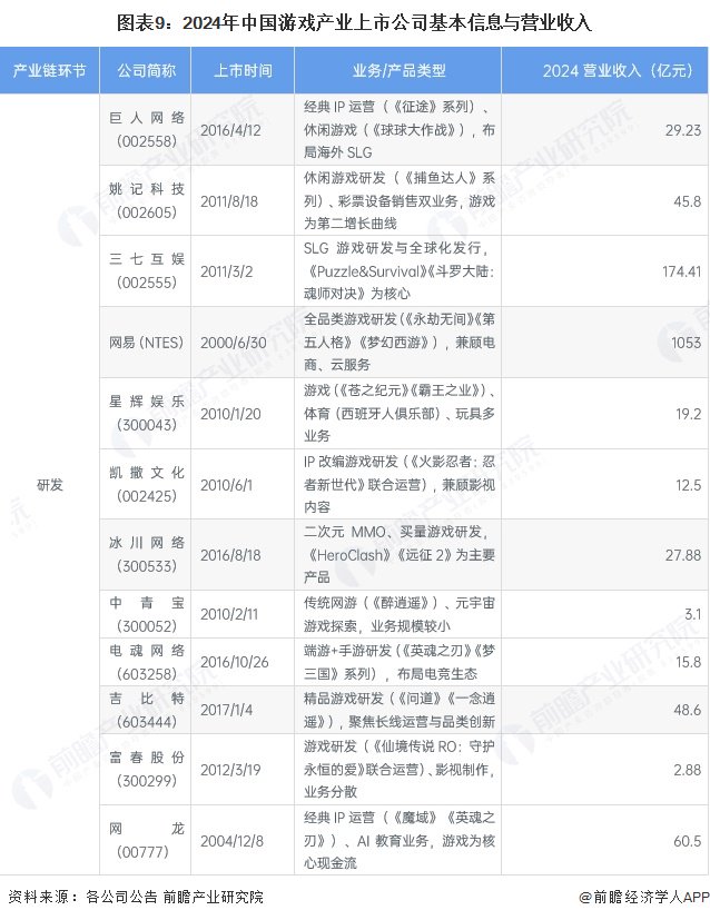 行业主要上市公司:腾讯控股(00700.HK);网易(09999.HK);哔哩哔哩(09626.HK);友谊时光(06820.HK);中手游(00302.HK);ST天润(002113.SZ);惠程科技(002168.SZ);游族网络(002174.SZ);天娱数科(002354.SZ);凯撒文化(002425.SZ);恺英网络(002517.SZ);三七互娱(002555.SZ);巨人网络(002558.SZ);世纪华通(002602.SZ);完美世界(002624.SZ);宝通科技(300031.SZ);星辉娱乐(300043.SZ);三五互联(300051.SZ);中青宝(300052.SZ);顺网科技(300113.SZ);富春股份(300299.SZ);掌趣科技(300315.SZ);昆仑万维(300418.SZ);汤姆猫(300459.SZ);迅游科技(300467.SZ);盛天网络(300494.SZ);盛讯达(300518.SZ);冰川网络(300533.SZ);大晟文化(600892.SH);电魂网络(603258.SH);吉比特(603444.SH);中科云网(002306.SZ);鼎龙文化(002502.SZ);姚记科技(002605.SZ);神州泰岳(300002.SZ);天舟文化(300148.SZ);浙数文化(600633.SH);文投控股(600715.SH);ST瀚叶(600226.SH)。