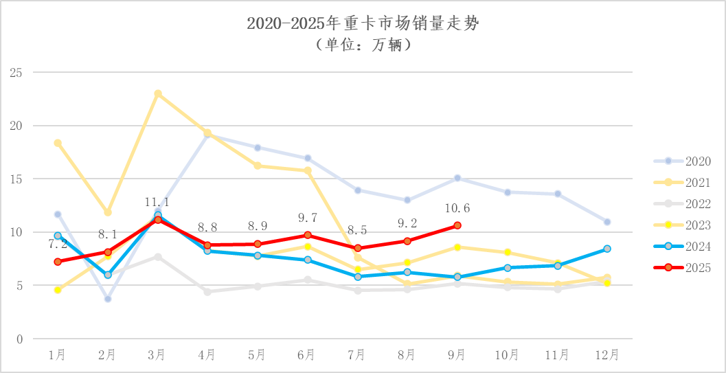 由最近5年重卡市场走势图可以看出,2025年9月份重卡市场翘尾明显,市场从7月份开始上行,9月份超10万辆的成绩表现非常亮眼,也为四季度市场继续增长奠定利好开局。