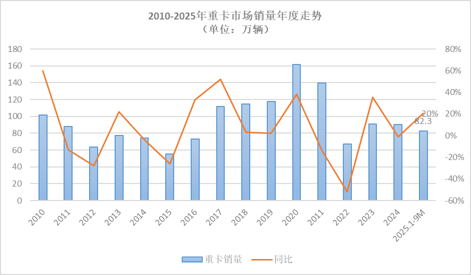 从累计销量来看,1-9月份重卡市场累销82.28万辆,同比增长20.5%。根据图中销量柱状图和走势曲线我们可以看出,在2025年1-9月销量近乎接近去年全年水平,全年销量超过100万辆几成定局。