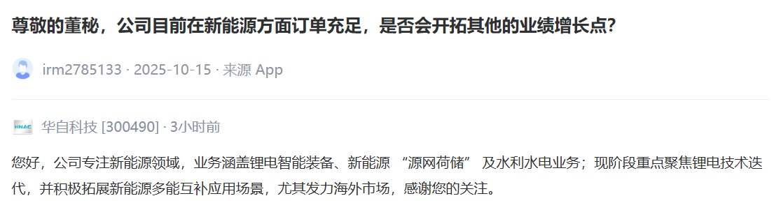上证报中国证券网讯华自科技16日在互动平台上回答投资者提问时表示,公司专注新能源领域,业务涵盖锂电智能装备、新能源 “源网荷储” 及水利水电业务;现阶段重点聚焦锂电技术迭代,并积极拓展新能源多能互补应用场景,尤其发力海外市场。