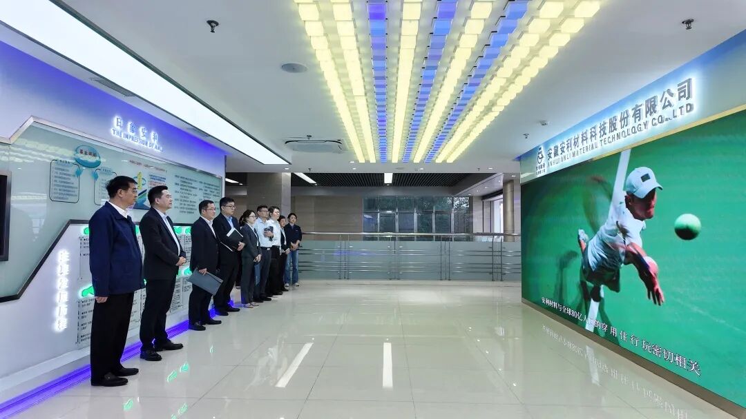 王才先行长一行首先观看了安利股份企业宣传片。走进展厅,简约大气展示区便引得王才先行长一边浏览,一边称赞。一块块显示屏清晰标注着企业领先的绿色工艺技术、科技赋能与品牌实力,图文并茂,满是专业与科技感。安利股份的产品琳琅满目,应用领域广泛,其鲜明的色彩、优良的质感与肤感,引起大家的兴趣,不时驻足观望,上手感受产品细节,并表示安利股份的未来发展空间广阔,值得期待。